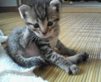 8月7日、次男の運動会の後、「長崎の保健所の命を救う会」主催による里親譲渡会へ行ってきました。生後三週間、6匹のアメショーの可愛らしさは群を抜いていて釘付け。美しいシルバータビー(まさにキョンキョン主演「グーグーだって猫である」のグーグーさながら)、元気いっぱい、すこぶる可愛い兄弟たち、でも一匹だけブラウンで最も小さいこの子は私と一番に目があい、ずっとすがるように見つめてくる。その眼差しにやられてしまいました。「おまえなのね」ピンとくるような絆を感じて決めてしまいました。